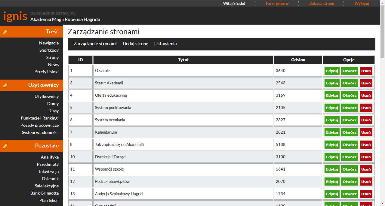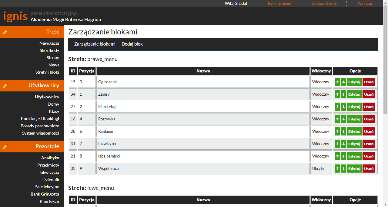Strony Odpowiednik infopages. Administratorzy Dla każdego admina można określić poziom dostępu. Motywy Zarządzanie themami strony. Wygodny manager plików Wgrywanie i łatwe wstawianie obrazków i innych plików do newsów, stron i dowolnych innych miejsc. Bloki Bloki w szablonie które możesz dowolnie wypełniać tekstem, obrazkami i shortcodami.